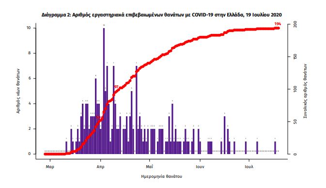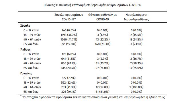 Τέλος, δεν έχει καταγραφεί κανένας νέος θάνατος ενώ έχουμε 194 θανάτους συνολικά στη χώρα. 63 (32,5%) είναι γυναίκες και οι υπόλοιποι άνδρες. Η διάμεση ηλικία των θανόντων συμπολιτών μας ήταν τα 76 έτη και το 95,9% είχε κάποιο υποκείμενο νόσημα ή/και ηλικία 70 ετών και άνω.