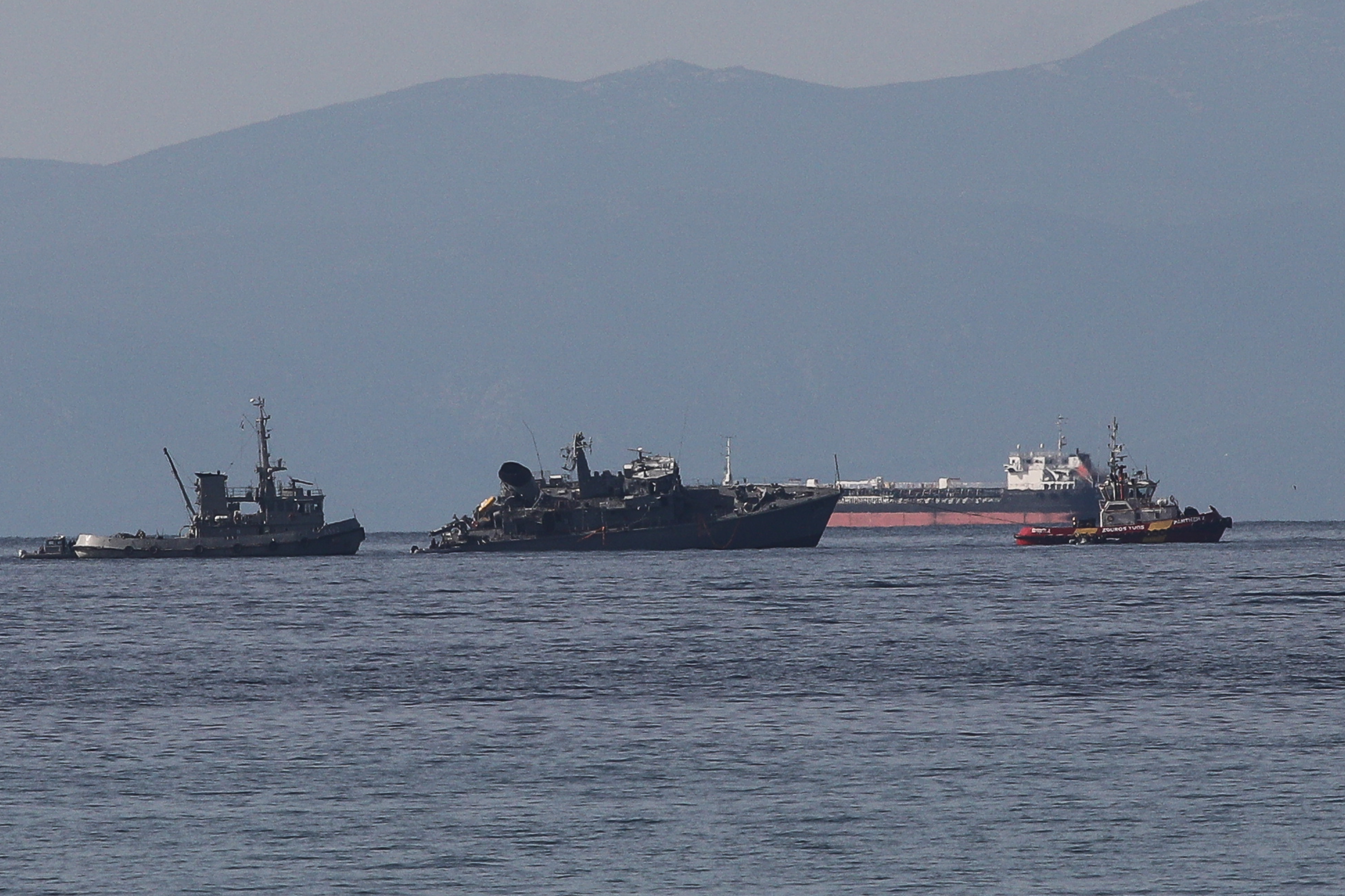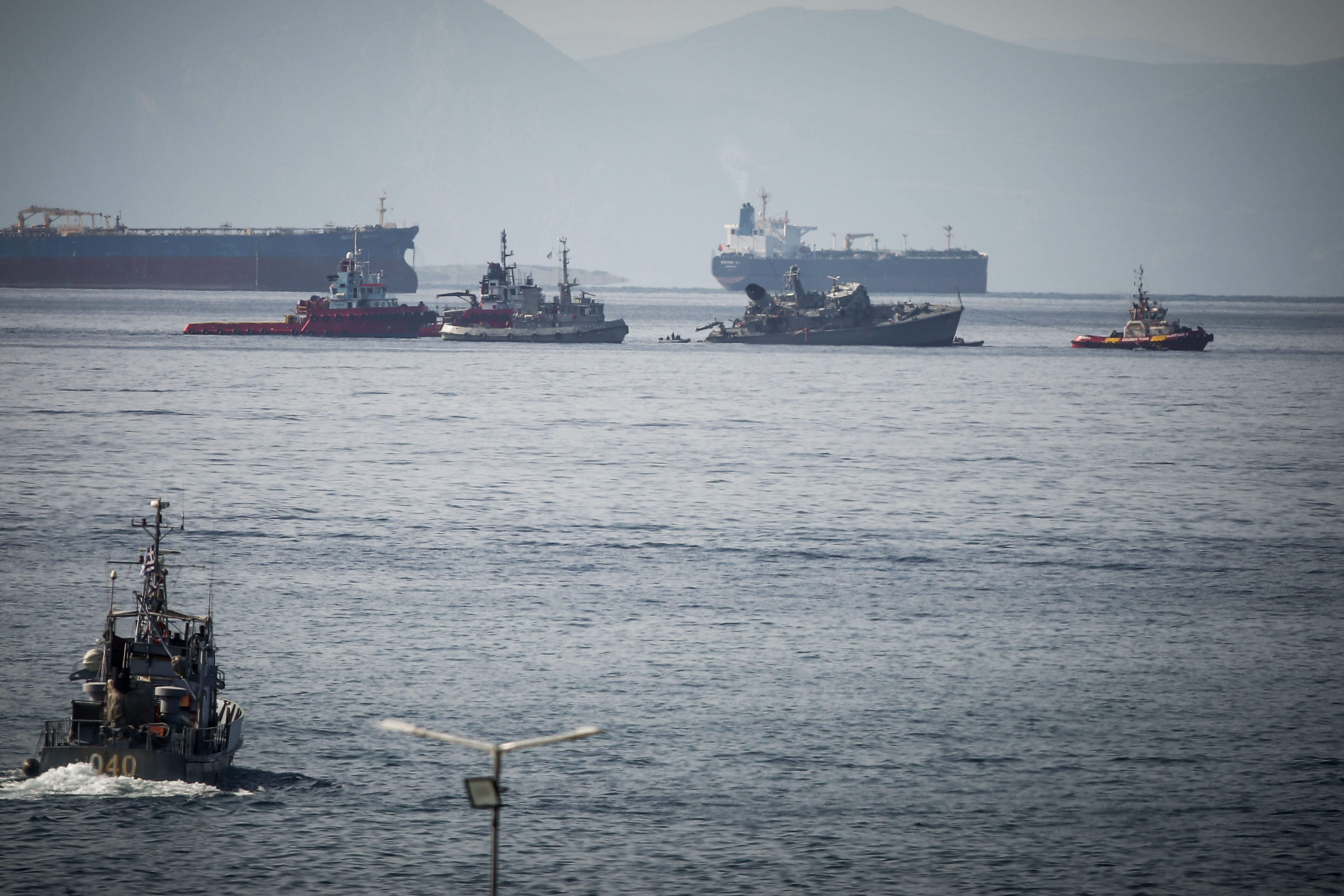 Πρόσθεσε ότι από τη σφοδρή σύγκρουση προκλήθηκε εισροή υδάτων στο ναρκοθηρευτικό πλοίο, ενώ άμεσα οργανώθηκε επιχείρηση διάσωσης των μελών του πληρώματος του ναρκοθηρευτικού από τρία περιπολικά σκάφη του Λιμενικού, δύο αντιρρυπαντικά, ομάδα Μονάδας Υποβρυχίων Αποστολών, πλοίο και ελικόπτερο του Πολεμικού Ναυτικού και τέσσερα ρυμουλκά.