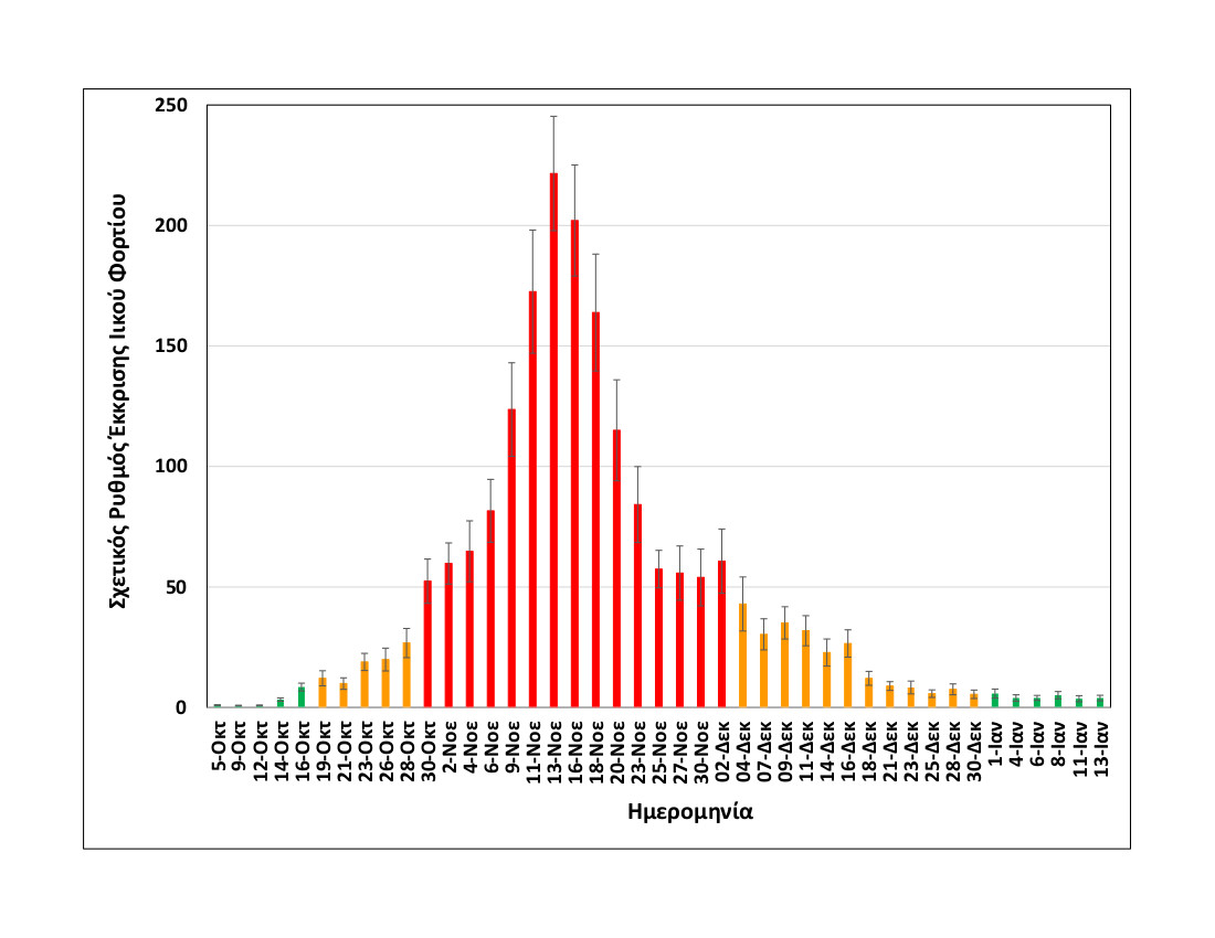 Στο συνημμένο διάγραμμα, που δημοσιεύει το ΑΠΕ-ΜΠΕ, οι ημέρες των δειγματοληψιών που καταγράφονται με κόκκινο χρώμα αντιστοιχούν σε περισσότερα από 500 κρούσματα - όπως ανακοινώθηκαν τις αντίστοιχες ημέρες από τον ΕΟΔΥ - οι μέρες που καταγράφονται με πορτοκαλί σε 100-400 κρούσματα και οι μέρες που καταγράφονται με πράσινο σε λιγότερα από εκατό κρούσματα.