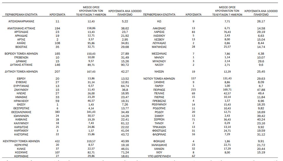 Η γεωγραφική κατανομή των 3.232 κρουσμάτων covid-19 που ανακοίνωσε σήμερα ο ΕΟΔΥ έχει ως εξής: