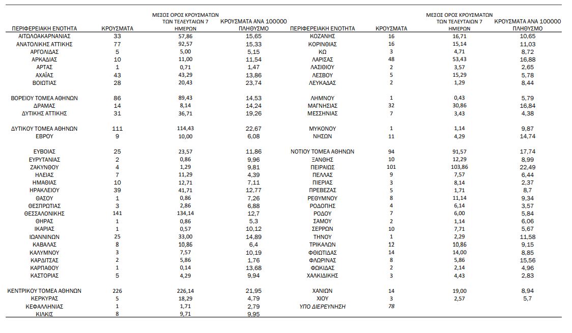 Όσον αφορά τη γεωγραφική κατανομή των νέων κρουσμάτων, σύμφωνα με τα στοιχεία του ΕΟΔΥ, στην Αττική εντοπίστηκαν 737 και στη Θεσσαλονίκη 141 νέες μολύνσεις.
