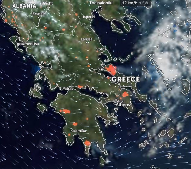Η εφαρμογή Zoom Earth μεταδίδει από δορυφόρο το πύρινο μέτωπο στην νοτιοανατολική Ευρώπη και την Ελλάδα. Όπως φαίνεται και στην εφαρμογή υπάρχουν πολλαπλά ενεργά μέτωπα σε Αττική, Εύβοια, Ηλεία, Μεσσηνία, Φωκίδα και Φθιώτιδα ενώ διακρίνονται και τα πύρινα μέτωπα στην Νοτιοδυτική Τουρκία, και την Αλβανία.