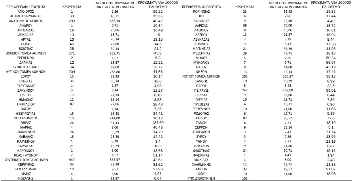 Κατανομή ανακοινωθέντων εγχώριων κρουσμάτων: Από το σύνολο των 2.847 νέων κρουσμάτων του νέου ιού στη χώρα 1 είναι εισαγόμενα. Η κατανομή των 2.846 νέων εγχώριων κρουσμάτων ανά Περιφερειακή Ενότητα παρουσιάζεται στον κατωτέρω πίνακα: