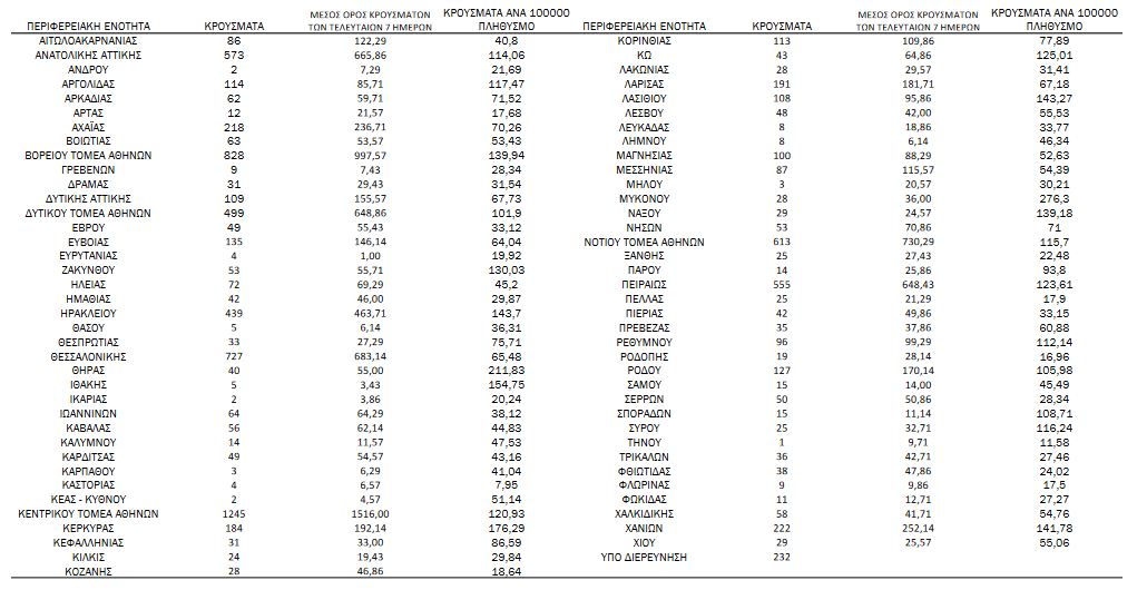 "Τα νέα εργαστηριακά επιβεβαιωμένα κρούσματα της νόσου(άτομα) που καταγράφηκαν τις τελευταίες 24 ώρες ήταν 7.682. Ο συνολικός αριθμός των ατόμων που νόσησαν ανέρχεται σε 3.624.556 (ημερήσια μεταβολή +0.2%), εκ των οποίων 48.6% άνδρες. Ο αριθμός πιθανών νέων επαναλοιμώξεων που καταγράφηκαν τις τελευταίες 24 ώρες ήταν 1.382 ενώ από την αρχή της πανδημίας SARS-CoV-2 ο συνολικός αριθμός εκτιμάται σε 161.547(4.3% του συνολικού αριθμού των θετικών αποτελεσμάτων).
