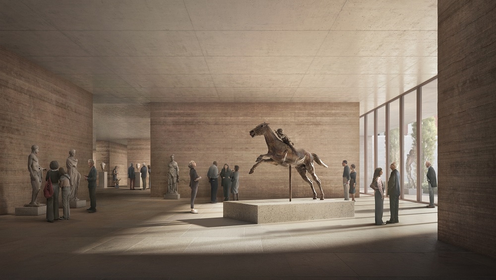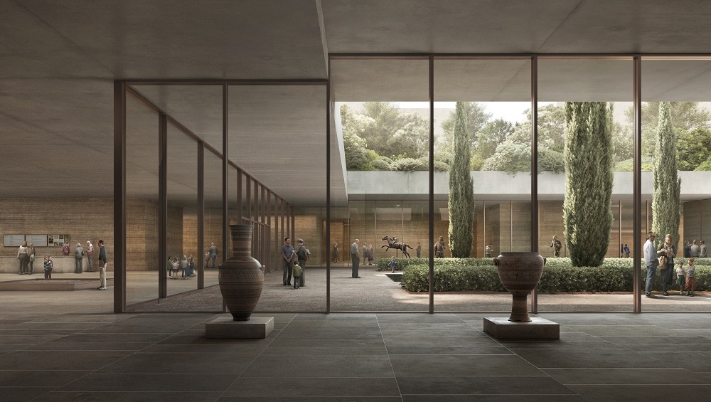 Εισερχόμενος στο μουσείο ο επισκέπτης ακολουθεί μια πορεία ενός συνεχούς, ροϊκού, εκθεσιακού χώρου που διατρέχει τα δύο επίπεδα του νέου κτηρίου και οδηγείται τελικά στο νεοκλασικό κτήριο. Ένα λιτό αρχιτεκτονικό λεξιλόγιο καθαρών όγκων, οι διαγώνιες οπτικές φυγές και οι τοίχοι που κατασκευάζονται από rammed-earth (συμπιεσμένο χώμα) δημιουργούν μια αντίθεση με τους ιστορικούς χώρους. Μαζί με ένα παιχνίδι ακριβείας φωτός και σκιάς, δημιουργούν μια δραματική αίσθηση στον υπόσκαφο χώρο, ένα ευαίσθητο υπόβαθρο για τα αντικείμενα και τα γλυπτά της συλλογής που θα εκτεθούν σε αυτόν.