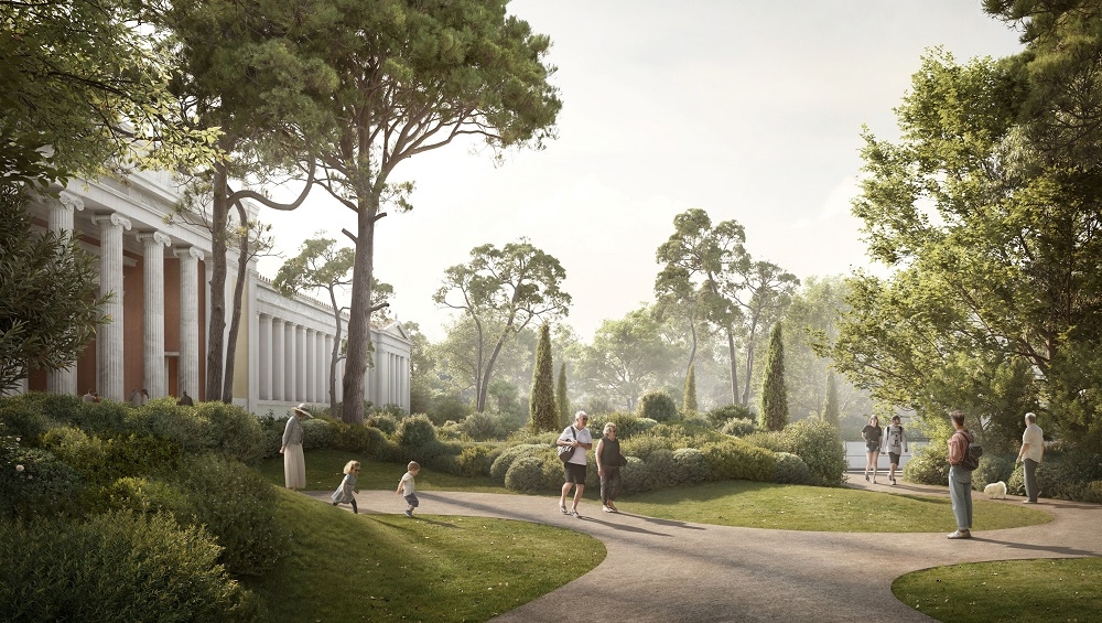 Αυτά τα πάρκα συχνά περιέβαλλαν κτήρια νεοκλασικών μουσείων σε ευρωπαϊκές πόλεις. Στη συγκεκριμένη περίπτωση, ωστόσο, ο σχεδιασμός παίρνει τη μορφή ενός μεγάλου κήπου στο δώμα της επέκτασης που εκμεταλλεύεται έξυπνα τη φυσική κλίση του εδάφους, που υποδηλώνεται με τους δύο κατηφορικούς δρόμους και στις δύο πλευρές του και που επιτρέπουν στο πάρκο να υψωθεί ήπια πάνω από την πολυσύχναστη ζωή του κεντρικού δρόμου της Αθήνας.