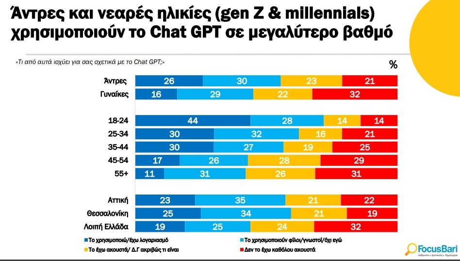 • Σιγά-σιγά όλο και περισσότεροι Έλληνες χρησιμοποιούν ή γνωρίζουν το chat GPT από φίλους και γνωστούς, με την Gen Z να ηγείται στη χρήση του.