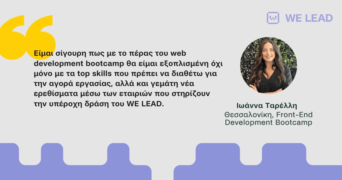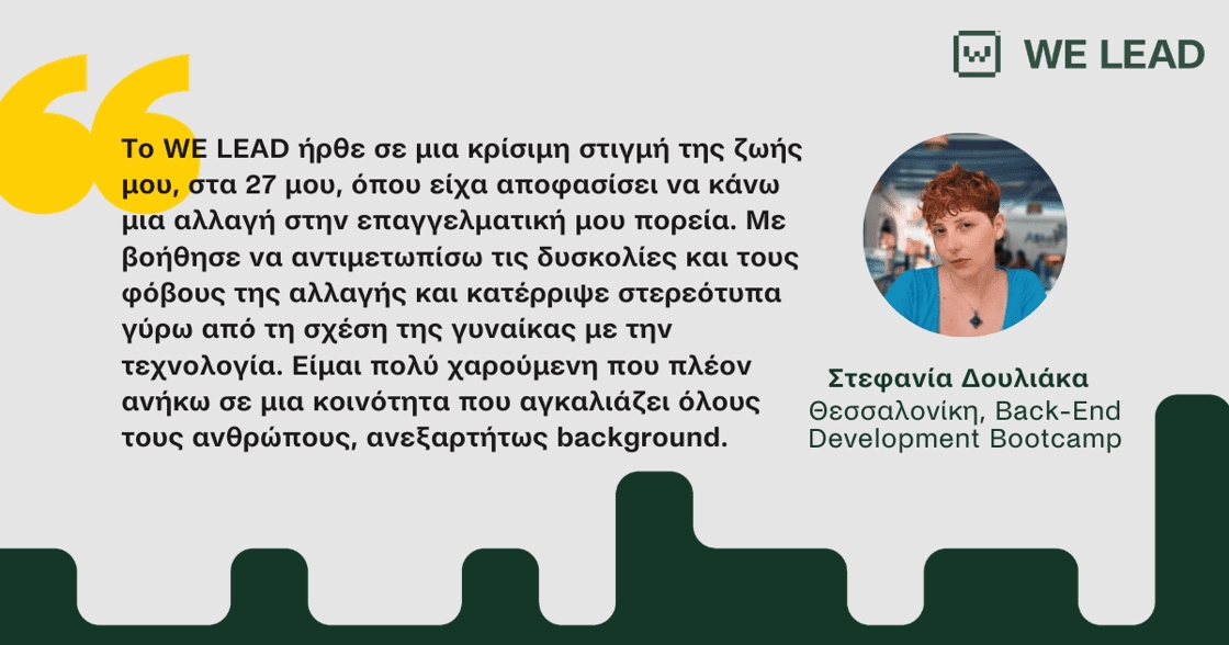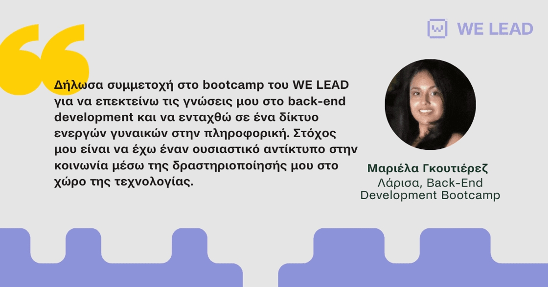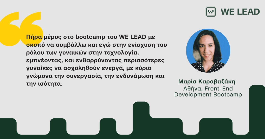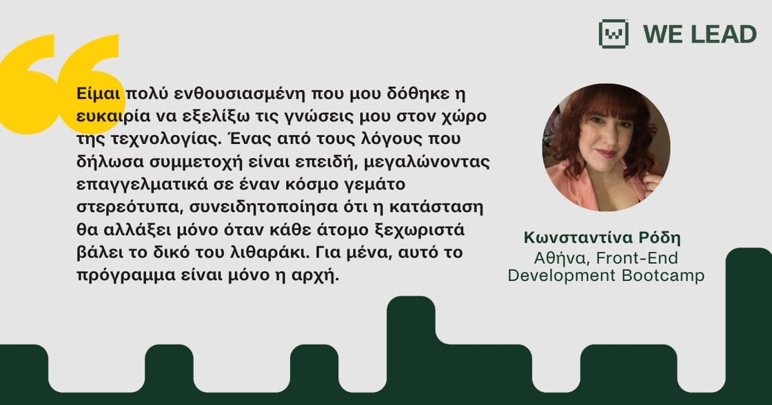 Πάνω από 400 αιτήσεις δέχθηκε το WE LEAD για τα online εκπαιδευτικά προγράμματα σε front-end και back-end development διάρκειας 15 εβδομάδων, τα οποία σχεδίασε σε συνεργασία με την Code.Hub. Τα bootcamps, τα οποία διατίθενται δωρεάν και απευθύνονται σε σις και τρανς γυναίκες, αποτελούν την πρώτη εκπαιδευτική πρωτοβουλία του WE LEAD, του νέου μη κερδοσκοπικού οργανισμού για τη γυναικεία ενδυνάμωση στο χώρο της τεχνολογίας και των επιχειρήσεων που ιδρύθηκε από το Libra Philanthropies τον Απρίλιο του 2023. Στόχος του οργανισμού είναι η μείωση του έμφυλου χάσματος στην τεχνολογία δίνοντας τη δυνατότητα σε περισσότερες γυναίκες να εισέλθουν, να αναπτυχθούν και να αναλάβουν ηγετικές θέσεις.