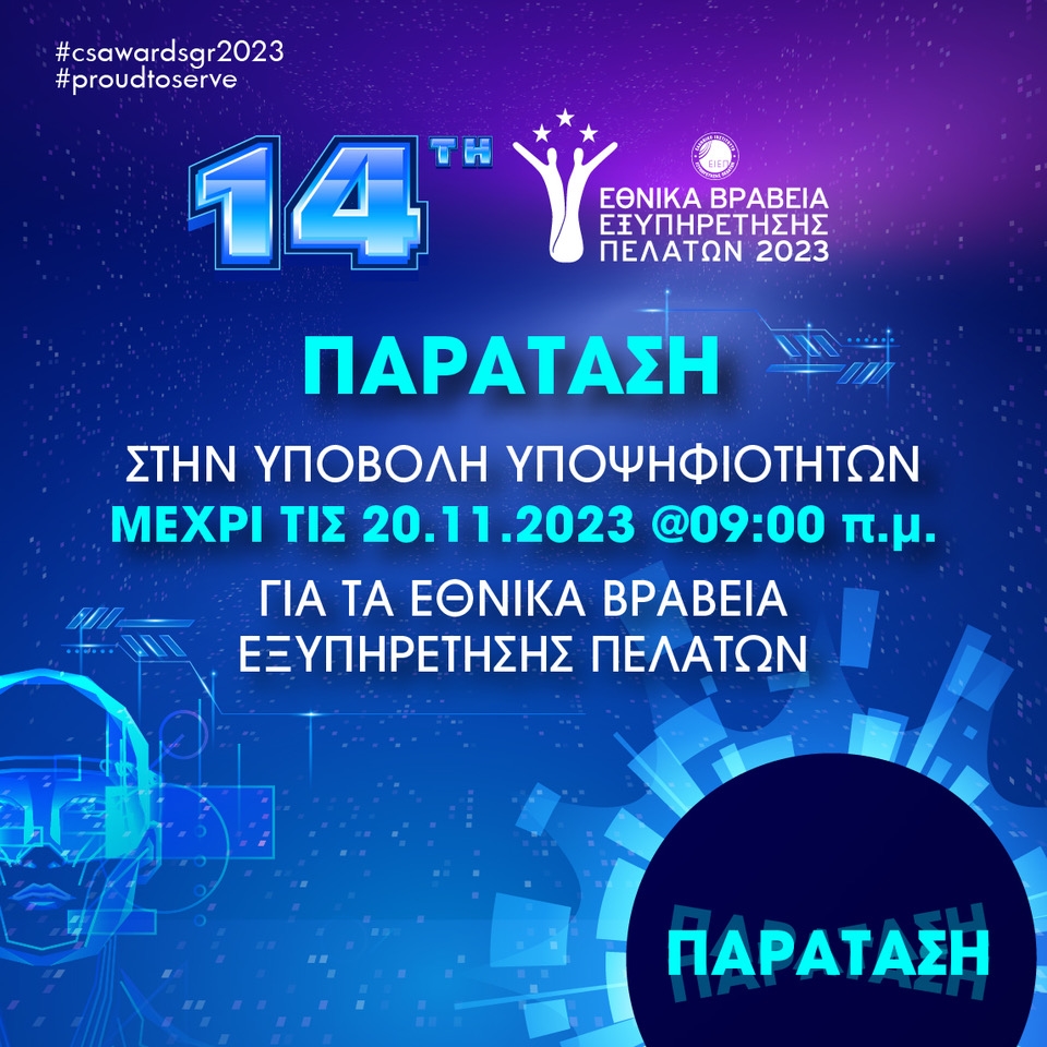 Παράταση για την υποβολή συμμετοχής έως τις 20 Νοεμβρίου 2023, στις 9:00 π.μ. δίνει το Ελληνικό Ινστιτούτο Εξυπηρέτησης Πελατών (ΕΙΕΠ) για τα Εθνικά Βραβεία Εξυπηρέτησης Πελατών 2023 (CS AWARDS), που στόχο έχουν να αναδείξουν τους καλύτερους στην Εξυπηρέτηση!