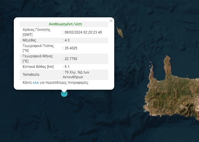 Σεισιμική δόνηση 4,3 Ρίχτερ ανοιχτά των Αντικυθήρων