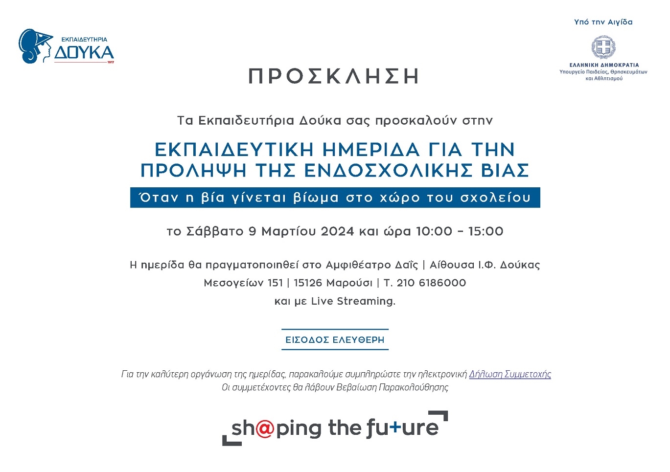Υπό την αιγίδα του Υπουργείου Παιδείας, Θρησκευμάτων και Αθλητισμού, και με αφορμή την 6η Μαρτίου που έχει καθιερωθεί ως Πανελλήνια Ημέρα κατά της βίας στα σχολεία, τα Εκπαιδευτήρια Δούκα θα φιλοξενήσουν διακεκριμένους επιστήμονες και ειδικούς για να αναλύσουν ποικίλες θεματικές που αφορούν στο σημαντικό αυτό φαινόμενο, όπως τους τομείς του σχολικού εκφοβισμού, τη βία στον ψηφιακό κόσμο, τη σχέση της οικογένειας και του σχολείου, τα εκπαιδευτικά προγράμματα πρόληψης και ψυχοσυναισθηματικής ενδυνάμωσης, τον θεσμό της σχολικής διαμεσολάβησης, τον αθλητισμό ως αντίδοτο στη βία, τη νομική διάσταση του φαινομένου, αλλά και τις δράσεις και τις πρωτοβουλίες σημαντικών φορέων και Ιδρυμάτων. Μέσα από τη γόνιμη συζήτηση που θα αναπτυχθεί, οι συμμετέχοντες θα έχουν την ευκαιρία να αποκτήσουν μια σφαιρική εικόνα για το ζήτημα, αλλά και τη γνώση για να το εντοπίσουν σε μία προσπάθεια να περιοριστεί το φαινόμενο της βίας στη ζωή των ανηλίκων και να αποτραπούν οι αρνητικές συνέπειες στην ψυχοκοινωνική τους ανάπτυξη.