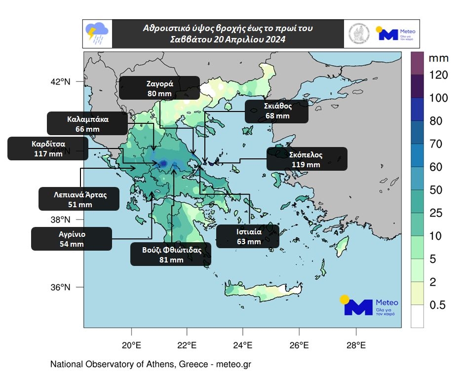Ισχυρές βροχοπτώσεις και καταιγίδες σημειώθηκαν κατά τόπους από το μεσημέρι της Παρασκευής 19/04 έως το πρωί του Σαββάτου 20/04. Σύμφωνα με τις καταγραφές του δικτύου αυτόματων μετεωρολογικών σταθμών του meteo.gr / Εθνικού Αστεροσκοπείου Αθηνών και σε συμφωνία με τις προγνώσεις, τα μεγαλύτερα ύψη βροχής καταγράφηκαν σε Θεσσαλία και Σποράδες. Το μέγιστο ύψος βροχής έως σήμερα καταγράφηκε στη Γλώσσα Σκοπέλου (119 χιλιοστά) και ακολούθησε η πόλη της Καρδίτσας (117 χιλιοστά).