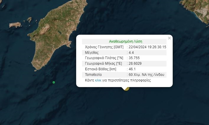 Σεισμός 4,4 Ρίχτερ σημειώθηκε ανοιχτά της Ρόδου. Σύμφωνα με το Γεωδυναμικό Ινστιτούτο το εστιακό του βάθος ήταν 46,1 χλμ. και σημειώθηκε 60 χλμ. νοτιοανατολικά της Λίνδου.