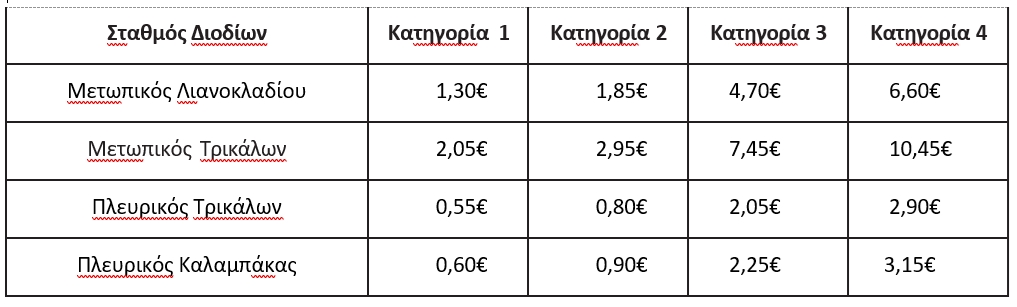 - 3 Μετωπικοί Σταθμοί Διοδίων (Λιανοκλαδίου, Σοφάδων και Τρικάλων) & 4 Πλευρικοί Σταθμοί Διοδίων (Ανάβρας, Προαστίου, Τρικάλων και Καλαμπάκας). Από μεσάνυχτα Τρίτης 23 Απριλίου προς Τετάρτη 24 Απριλίου θα ξεκινήσει η λειτουργία του νέου μετωπικού σταθμού Λιανοκλαδίου και των πλευρικών Τρικάλων και Καλαμπάκας. Οι τιμές των διοδίων τελών των νέων σταθμών καθώς και του μετωπικού Τρίκαλων είναι: