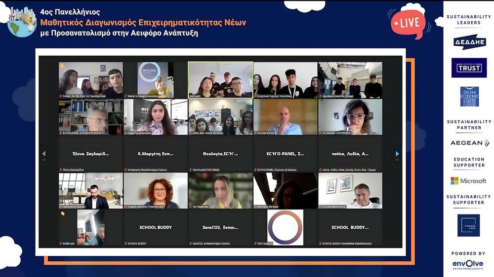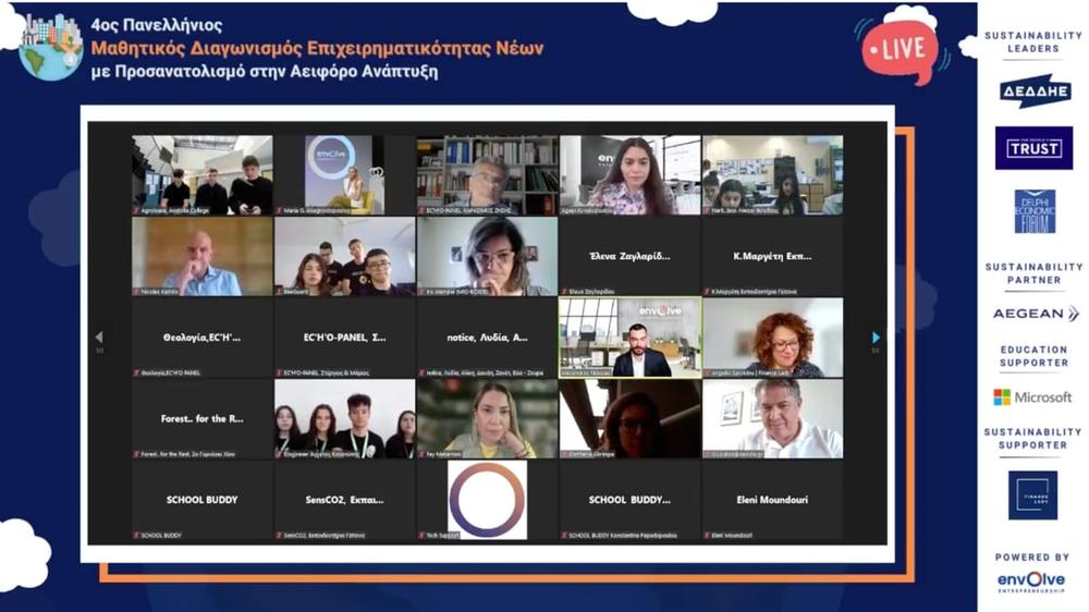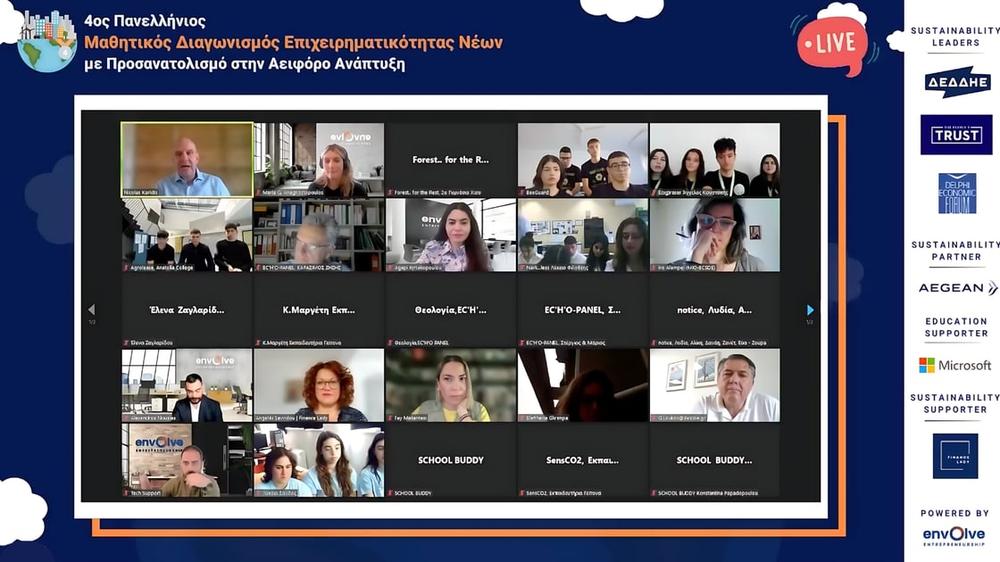 Για 4η συνεχόμενη χρονιά, διεξήχθη η τελετή βράβευσης του Πανελλήνιου Μαθητικού Διαγωνισμού Επιχειρηματικότητας Νέων με Προσανατολισμό στην Αειφόρο Ανάπτυξη. Το Envolve Entrepreneurship (https://envolveglobal.org/el/) ανακοίνωσε τους τέσσερις (4) νικητές του διαγωνισμού, σε ζωντανή ψηφιακή μετάδοση. Ο μαθητικός διαγωνισμός, συγκέντρωσε ενδιαφέρον από 112 Γυμνάσια και Λύκεια, από ολόκληρη την Ελλάδα. Οι νικητές του 4ου κύκλου του Διαγωνισμού, είναι οι SCHOOL BUDDY, Nark…Less, SensCO2 και Agrolease, από την Ξάνθη, τον Έβρο, την Αττική και τη Θεσσαλονίκη.
