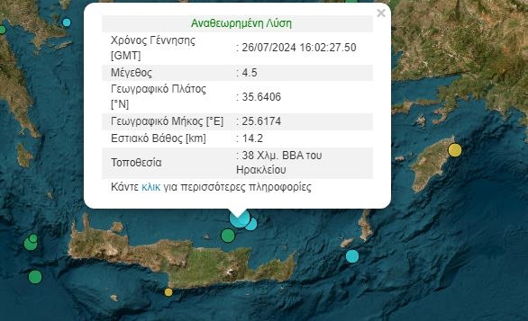 Το εστιακό βάθος εκτιμάται περί τα 10χλμ και το επίκεντρο βρίσκεται 49χλμ βορειοανατολικά της Νεαπόλεως. Η δόνηση έγινε αισθητή τόσο στην περιοχή τού Ηρακλείου όσο και του Αγίου Νικολάου, χωρίς να αναφερθούν ζημιές ή άλλα προβλήματα.