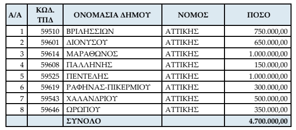 Το συνολικό ποσό των 4,7 εκατ. ευρώ για την αντιμετώπιση των εκτάκτων αναγκών καθώς και τη διαχείριση των συνεπειών της πυρκαγιάς της 11ης Αυγούστου 2024 κατανέμεται σύμφωνα με τον κάτωθι πίνακα: