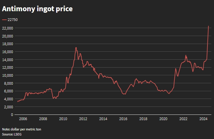 Ειδικότερα, το Reuters αναφέρει ότι η απόφαση της Κίνας να περιορίσει τις εξαγωγές αντιμονίου από τις 15 Σεπτεμβρίου είναι πιθανό να οδηγήσει τις τιμές του μετάλλου που χρησιμοποιείται σε πυρομαχικά και μπαταρίες σε νέα ρεκόρ, καθώς οι αγοραστές αναζητούν περισσότερο υλικό για να αποθηκεύσουν, όπως δήλωσαν αναλυτές και traders την περασμένη εβδομάδα.