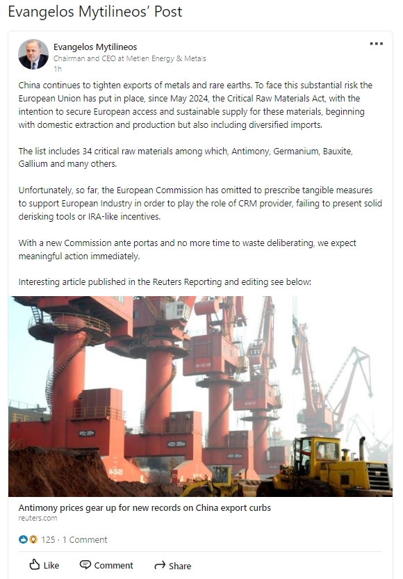 "Η Κίνα συνεχίζει να περιορίζει τις εξαγωγές μετάλλων και σπάνιων γαιών. Για να αντιμετωπίσει αυτόν τον σημαντικό κίνδυνο, η Ευρωπαϊκή Ένωση έχει θέσει σε εφαρμογή, από τον Μάιο του 2024, τον νόμο για τις κρίσιμες πρώτες ύλες, με σκοπό να διασφαλίσει την ευρωπαϊκή πρόσβαση και τον βιώσιμο εφοδιασμό των εν λόγω υλικών, ξεκινώντας από την εγχώρια εξόρυξη και παραγωγή, αλλά περιλαμβάνοντας επίσης διαφοροποιημένες εισαγωγές", σχολιάζει ο πρόεδρος και διευθύνων σύμβουλος της Metlen, Ευάγγελος Mυτιληναίος, σε ανάρτησή του στο linkedin με αφορμή άρθρο του Reuters.