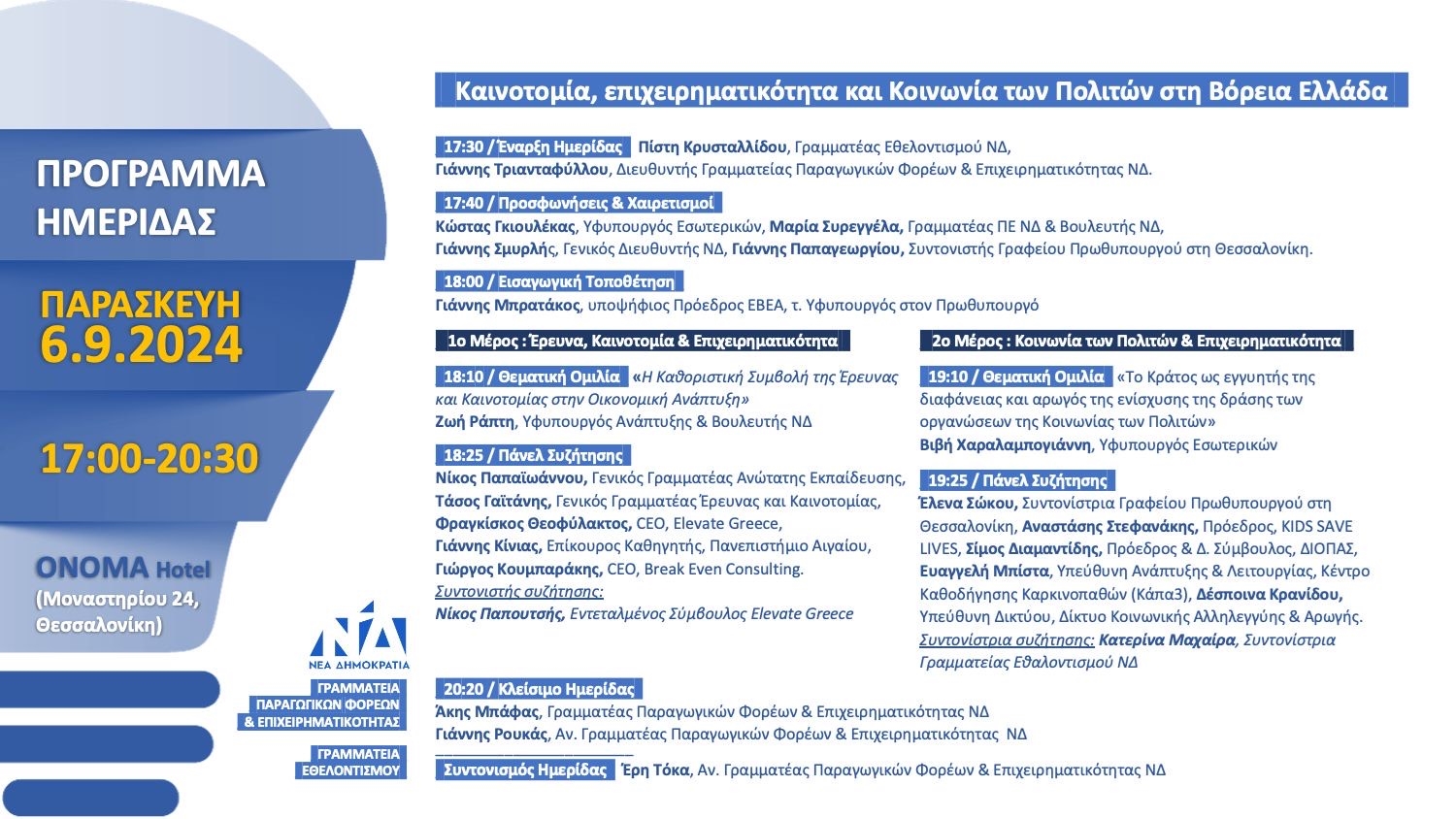 Την Παρασκευή 6 Σεπτεμβρίου 2024, από τις 17:00 ως τις 20:30, στο ONOMA Hotel (Μοναστηρίου 24, Θεσσαλονίκη) θα λάβει χώρα η ημερίδα που διοργανώνει η Γραμματεία Παραγωγικών Φορέων & Επιχειρηματικότητας (Γραμματεία Παραγωγικών Τομέων) της ΝΔ μαζί με την Γραμματεία Εθελοντισμού του κόμματος με θέμα: "Καινοτομία, επιχειρηματικότητα και Κοινωνία των Πολιτών στη Βόρεια Ελλάδα".