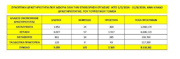 Στον πίνακα που ακολουθεί αναφέρονται τα στοιχεία ελέγχων, από τον Μάιο έως και τον Αύγουστο, ανά επιμέρους κλάδο του τουριστικού τομέα.