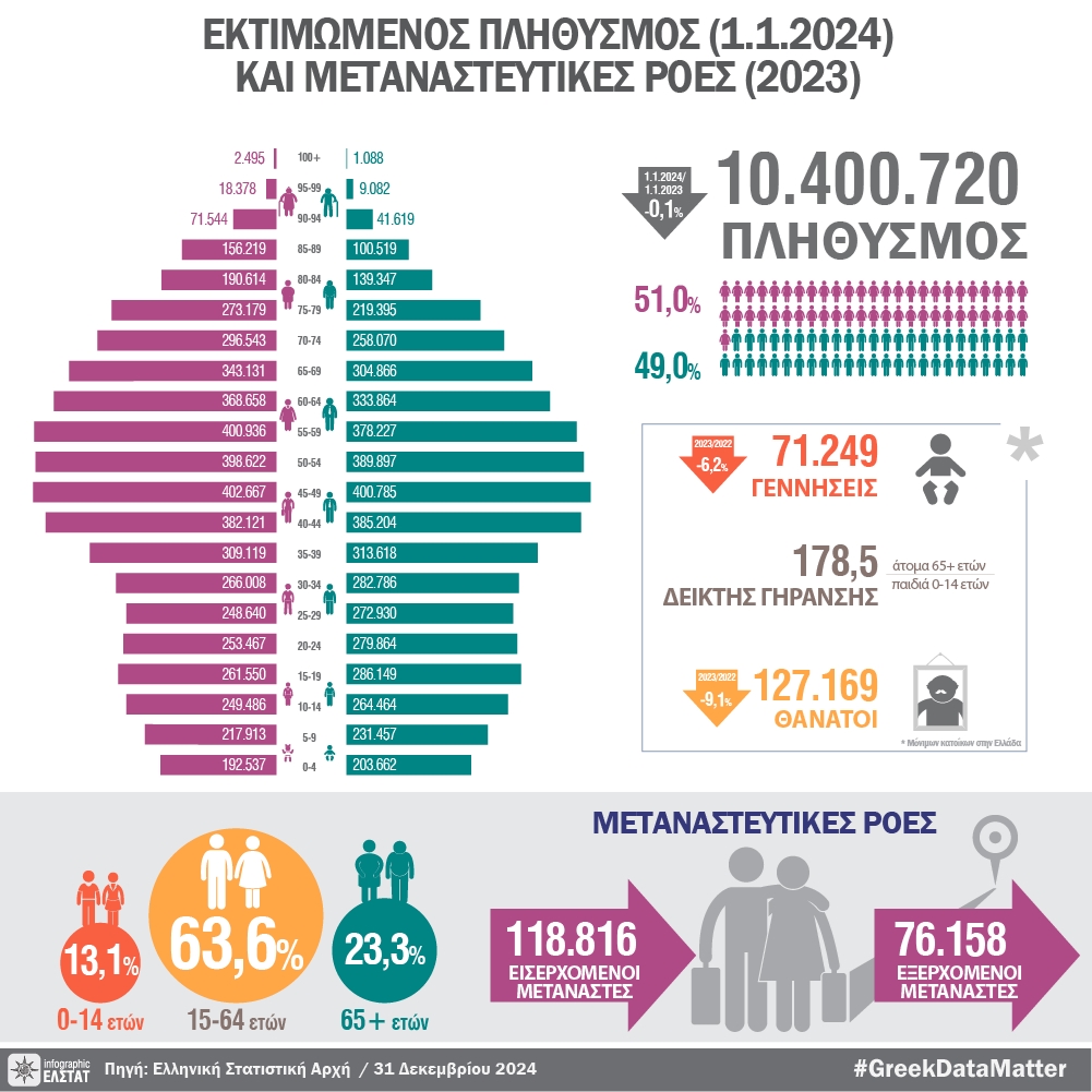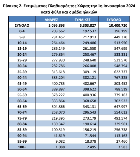 Σε άλλα στοιχεία, ο μόνιμος πληθυσμός της Ελλάδας κατά την 1η Ιανουαρίου 2024 εκτιμάται σε 10.400.720 άτομα (5.096.893 άνδρες και 5.303.827 γυναίκες), μειωμένος κατά 0,1% σε σχέση με τον αντίστοιχο πληθυσμό της 1ης Ιανουαρίου 2023 που ήταν 10.413.982 άτομα.