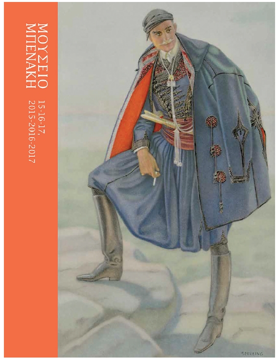 Στο εξώφυλλο του τελευταίου τόμου του επιστημονικού περιοδικού του Μουσείου Μπενάκη εικονίζεται ο Αντώνης Μπενάκης με αστική ενδυμασία της Κρήτης. Πρόκειται για μια υδατογραφία του Ρώσου ζωγράφου Nikolai Sperling, που δημοσιεύθηκε το 1954 στον β’ τόμο της μνημειακής έκδοσης "Ελληνικαί Εθνικαί Ενδυμασίαι" .Το δίτομο αυτό λεύκωμα, που ουσιαστικά συνιστά την πρώτη επιστημονική απόπειρα ανθολόγησης τοπικών ενδυμασιών από όλη την Ελλάδα, υλοποιήθηκε χάρη στην πρωτοβουλία, την προσωπική μέριμνα και τις δαπάνες του Αντώνη Μπενάκη, με στόχο τη γνωριμία του ευρύτερου κοινού με τους "θησαυρούς", όπως γράφει ο ίδιος, της ελληνικής λαϊκής τέχνης. Περιλαμβάνει 112 ζωγραφικά έργα του Sperling, στα οποία μέλη από τον κοινωνικό περίγυρο του Μπενάκη εικονίζονται με ελληνικές ενδυμασίες. Η εικονογράφηση πλαισιώνεται επιστημονικά με κείμενα της Αγγελικής Χατζημιχάλη, στην οποία η ελληνική λαογραφία χρωστά τις βάσεις για τη μελέτη των παραδοσιακών φορεσιών. Για να επιστρέψουμε όμως στο εξώφυλλο, θέλω να εξηγήσω ότι το εικονογραφικό θέμα του εξωφύλλου προκύπτει από το περιεχόμενο του εκάστοτε τόμου και εδώ παραπέμπει στη μελέτη της Ξένιας Πολίτου, επιμελήτριας της Συλλογής Νεοελληνικού Πολιτισμού του Μουσείου Μπενάκη, που διερευνά τη σχέση του λευκώματος με την αντίστοιχη μουσειακή συλλογή.