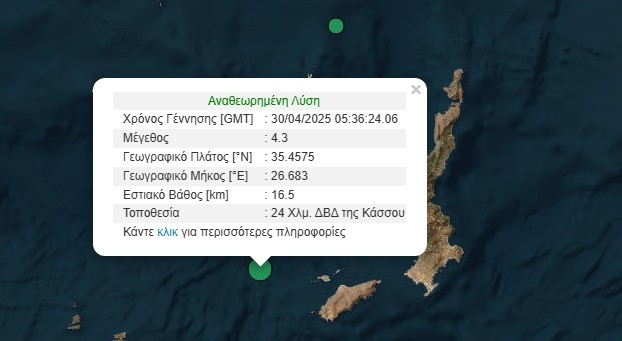 Σύμφωνα με το Γεωδυναμικό Ινστιτούτο του Εθνικού Αστεροσκοπείου Αθηνών, το επίκεντρο της δόνησης εντοπίζεται στον θαλάσσιο χώρο 24 χλμ. δυτικά-βορειοδυτικά της Κάσου.