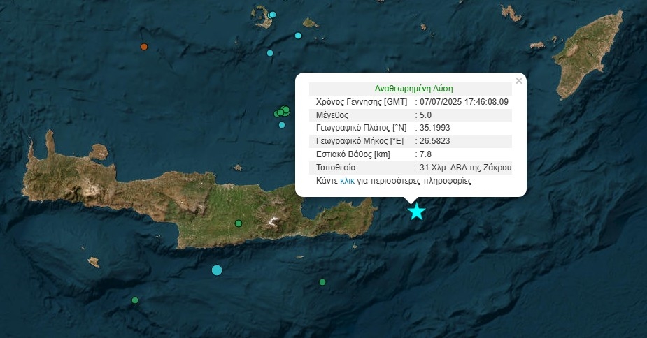 Σεισμός 5 Ρίχτερ σημειώθηκε πριν από λίγο 31 χλμ ΑΒΑ της Ζάκρου. ; Σύμφωνα με τα στοιχεία του Γεωδυναμικού Ινστιτούτου, το εστιακό βάθος υπολογίζεται στα 7,8 χιλιόμετρα. ;