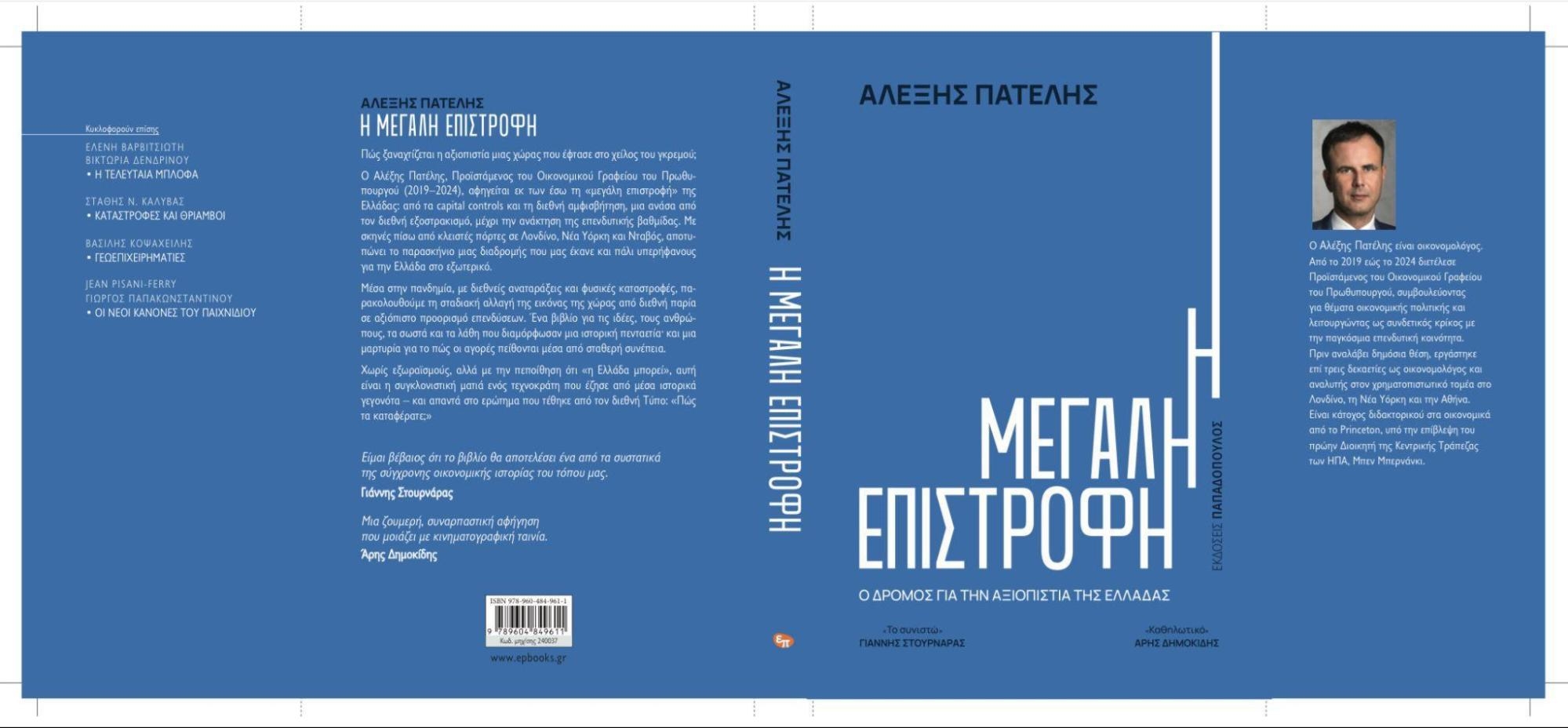 Ο Αλέξης Πατέλης, Προϊστάμενος του Οικονομικού Γραφείου του Πρωθυπουργού (2019–2024), αφηγείται στη "Μεγάλη Επιστροφή: Ο δρόμος για την αξιοπιστία της Ελλάδας" πώς η χώρα πέρασε από τα capital controls και τη διεθνή αμφισβήτηση στην ανάκτηση της εμπιστοσύνης της διεθνούς κοινότητας.