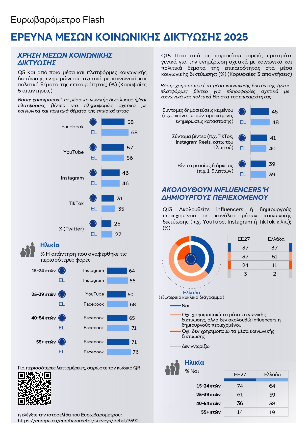 · Σχεδόν επτά στους δέκα (68%) προτιμούν να χρησιμοποιούν το Facebook για να ενημερώνονται στην Ελλάδα, ποσοστό υψηλότερο από τον μέσο όρο στην ΕΕ (58%). Οι νέοι ηλικίας 15-24 ετών στην Ελλάδα δήλωσαν ότι πρώτη πηγή ενημέρωσής τους για κοινωνικά και πολιτικά ζητήματα είναι το Instagram (66%), γεγονός που συμβαδίζει και με τα δεδομένα για τους νέους γενικά στην ΕΕ (64%).