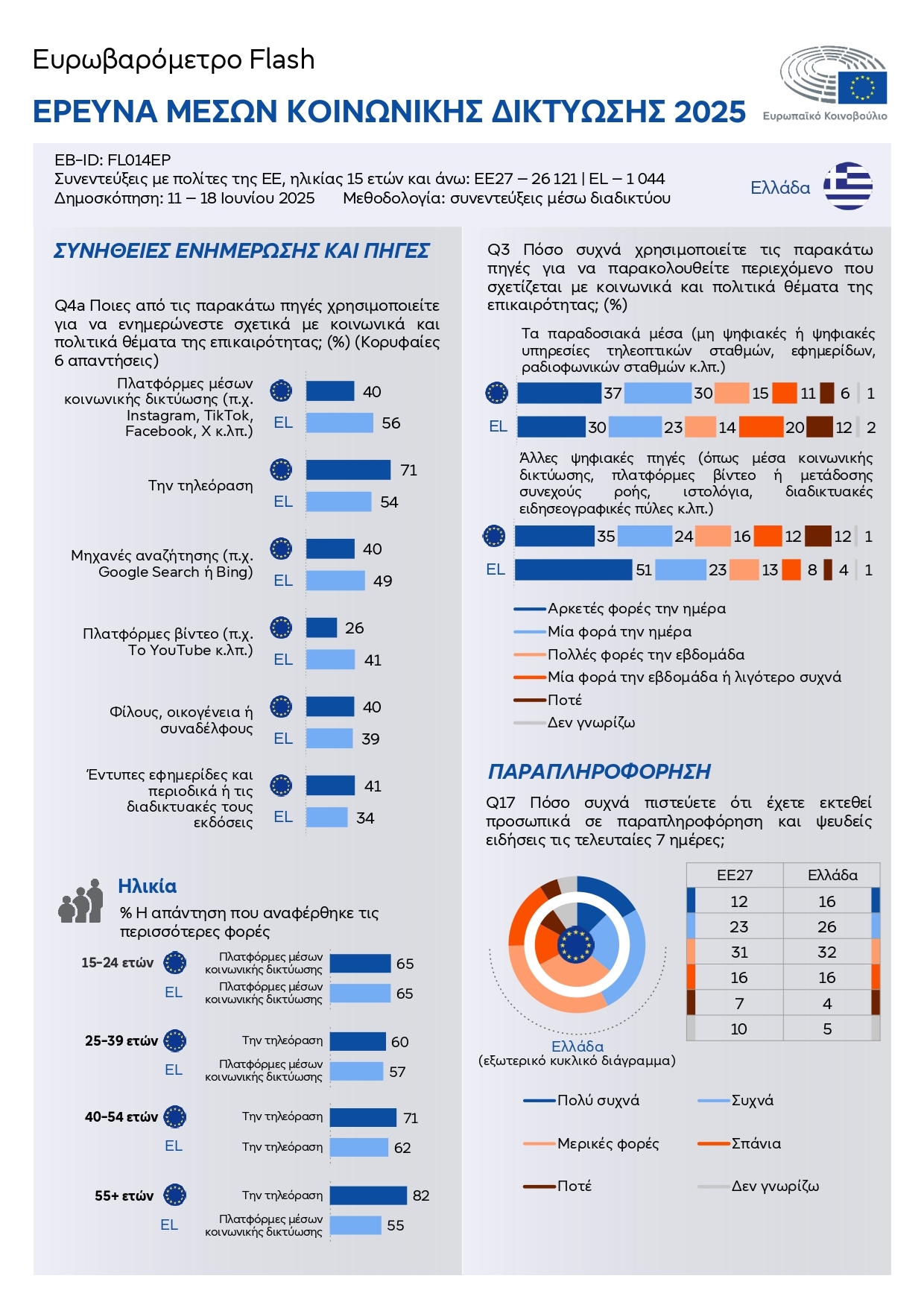 · Τα μέσα κοινωνικής δικτύωσης είναι πλέον το κυρίαρχο μέσο ενημέρωσης για πολιτικά και κοινωνικά ζητήματα για την πλειοψηφία των πολιτών στην Ελλάδα. Πάνω από πέντε στους δέκα (56%) χρησιμοποιούν στην Ελλάδα πλατφόρμες κοινωνικής δικτύωσης για να ενημερωθούν και δεύτερη έρχεται η τηλεόραση (54%), σε αντίθεση με τον μέσο όρο της ΕΕ που φαίνεται να προτιμά ακόμα την τηλεόραση για να ενημερωθεί (71%). Αξίζει να σημειωθεί πως μόλις το 34% των πολιτών στην Ελλάδα επιλέγουν να ενημερωθούν άμεσα από εφημερίδες, περιοδικά και διαδικτυακές εκδόσεις, τη στιγμή που ο ευρωπαϊκός μέσος όρος φτάνει το 41%.