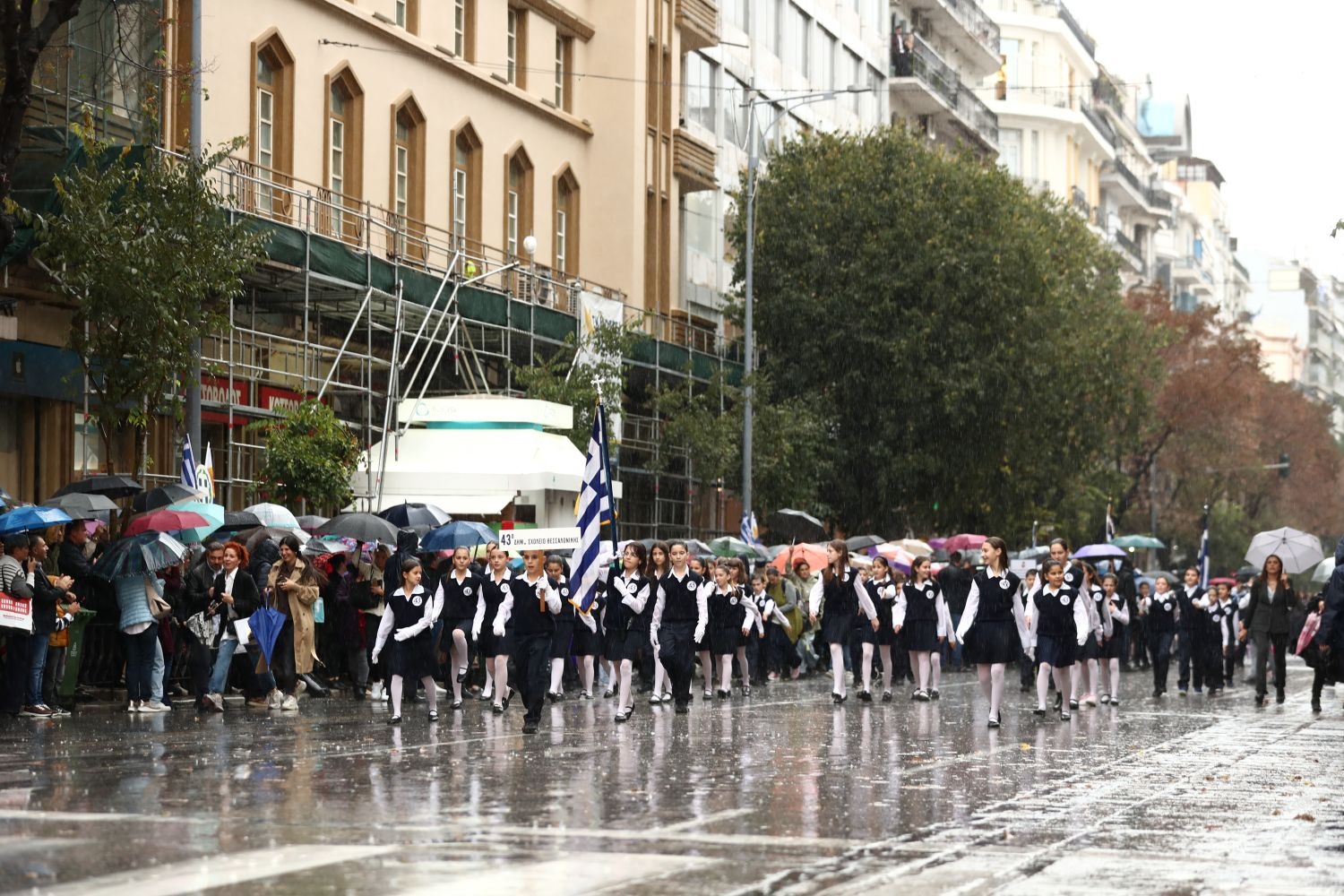 Υπό καταρρακτώδη βροχή παρέλασαν σήμερα το πρωί στο κέντρο της Θεσσαλονίκης μαθητές από 21 Δημοτικά, Γυμνάσια και Λύκεια, στο πλαίσιο του εορτασμού των επετείων της 26ης Οκτωβρίου 1912 και 28ης Οκτωβρίου 1940.