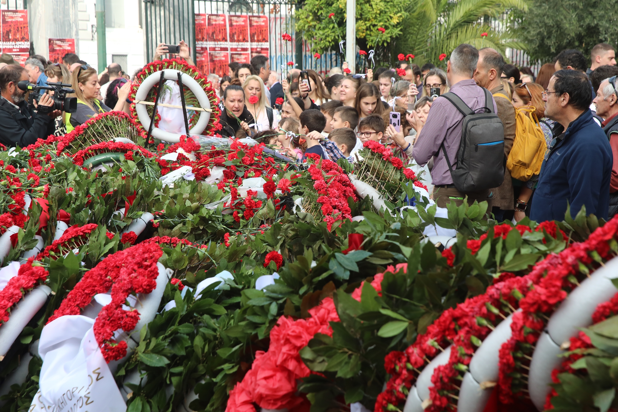 Κορυφώνονται σήμερα οι τριήμερες εκδηλώσεις τιμής και μνήμης του εορτασμού της 52ης επετείου της εξέγερσης των φοιτητών στο Πολυτεχνείο από τον τον Νοέμβριο του 1973. Πλήθος πολιτών όλων των ηλικιών καταθέτουν λουλούδια και στεφάνια στη μνήμη τους.