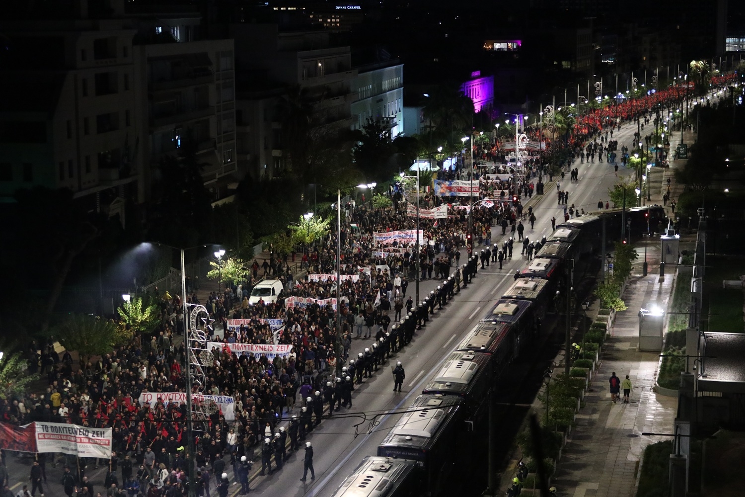 Άνθρωποι όλων των ηλικιών, φοιτητικοί σύλλογοι και συνδικάτα προχωρούν προς την Αμερικανική Πρεσβεία.