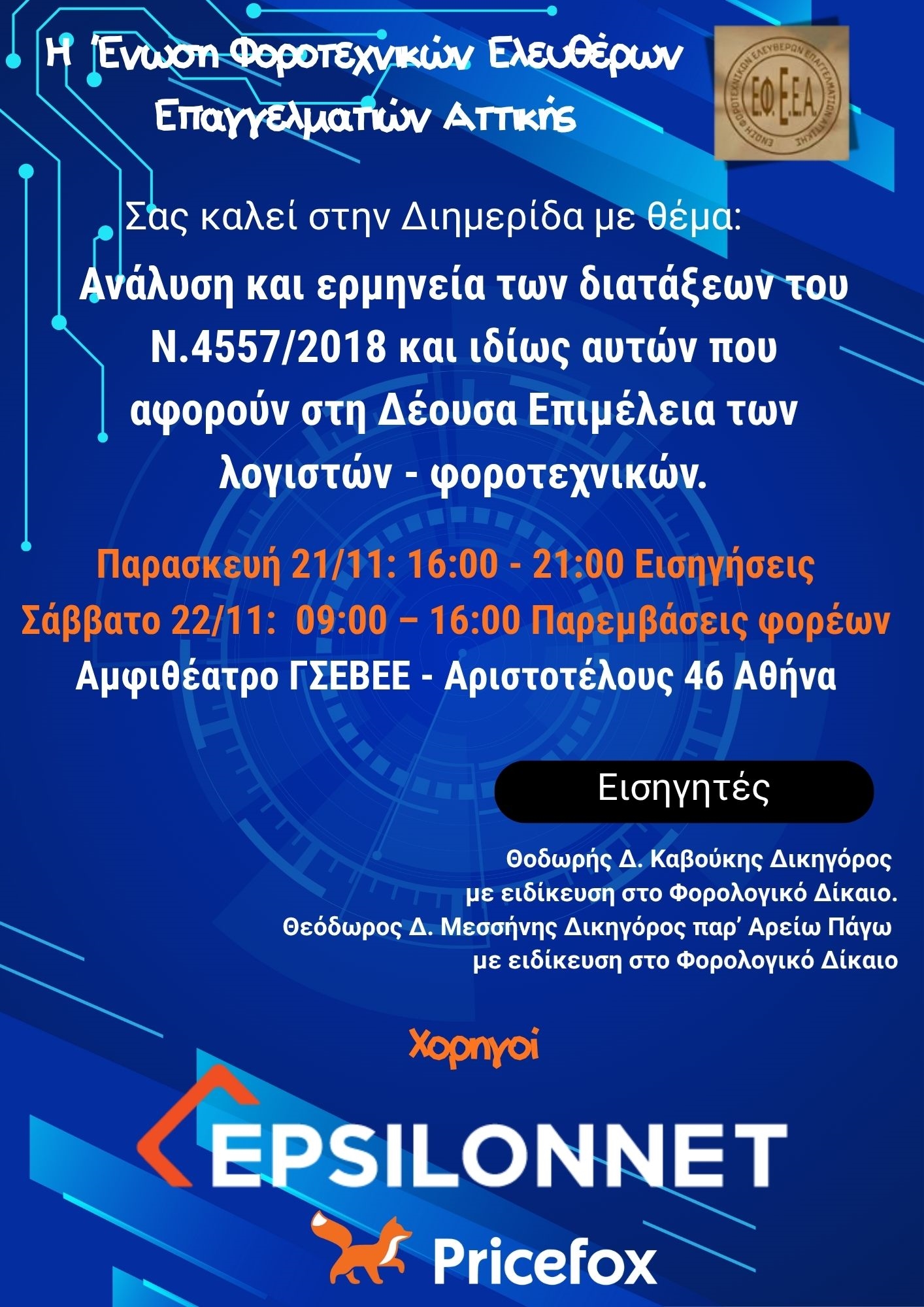 Για το σκοπό αυτή η Ένωση διοργανώνει διημερίδα ενημέρωσης με θέμα: "Ανάλυση και Ερμηνεία των Διατάξεων του Ν. 4557/2018 και ιδίως αυτών που αφορούν στη Δέουσα Επιμέλεια των Λογιστών – Φοροτεχνικών", στις 21–22 Νοεμβρίου 2025, στο Αμφιθέατρο της ΓΣΕΒΕΕ (Αριστοτέλους 46, Αθήνα), με ελεύθερη είσοδο.