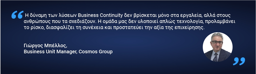 Σήμερα, η επιχειρησιακή συνέχεια δεν είναι απλώς στόχος. Κάθε λεπτό διακοπής λειτουργίας κοστίζει, και κάθε απώλεια δεδομένων υποσκάπτει την αξιοπιστία ενός οργανισμού. Η Cosmos Business Systems βρίσκεται στο πλευρό των επιχειρήσεων που δεν θέλουν να αφήσουν τίποτα στην τύχη.