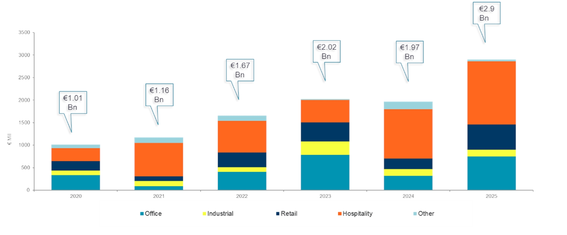 Σύμφωνα με τα στοιχεία της Proprius, συνολικά το 2025, οι κατηγορίες που ξεχώρισαν ήταν τα γραφεία και τα ξενοδοχεία, απορροφώντας το 27,3% και 44,5% του συνολικού επενδυμένου κεφαλαίου αντίστοιχα. Οι επενδύσεις στον ξενοδοχειακό κλάδο ανήλθαν σε €1,4 δισ. το 2025, ενώ ο κλάδος των γραφείων ακολούθησε με €750 εκατ. Ωστόσο, η κατηγορία που σημείωσε τη μεγαλύτερη ετήσια άνοδο ήταν η λιανική, δηλαδή τα εμπορικά καταστήματα, καταγράφοντας αύξηση 143% σε €560 εκατ. και σηματοδοτώντας ισχυρή επαναφορά της εμπιστοσύνης σε ακίνητα που συνδέονται με το λιανεμπόριο.