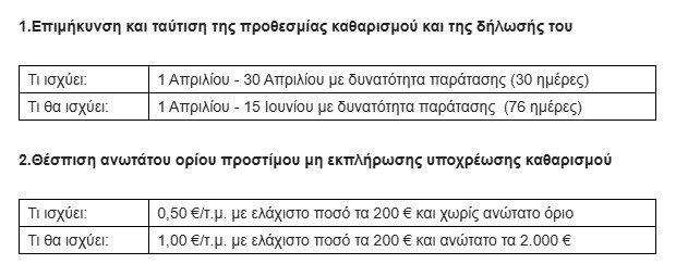 1. Περαιτέρω επιμήκυνση της προθεσμίας καθαρισμού και ταύτισή της με την προθεσμία της δήλωσης του καθαρισμού, στις 15 Ιουνίου εκάστους έτους.