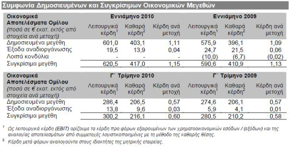 Σημειώνεται ότι το πρώτο εννεάμηνο του 2010 περιλαμβάνει χρέωση φόρων ύψους 21 εκατ. ευρώ (€0,06 ανά μετοχή), η οποία σχετίζεται με την «Έκτακτη, Εφάπαξ Εισφορά Κοινωνικής Ευθύνης» στην Ελλάδα.