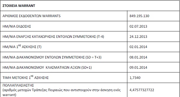 Σε συνέχεια των από 01.07.2013 & 02.07.2013 ανακοινώσεων της «ΤΡΑΠΕΖΑ ΠΕΙΡΑΙΩΣ Α.Ε.» (εφεξής η «Τράπεζα») αναφορικά με τους τελικούς όρους εισαγωγής και τα χαρακτηριστικά των Παραστατικών Τίτλων Δικαιωμάτων Κτήσης Μετοχών (εφεξής τα «Warrants») που εκδόθηκαν σύμφωνα με τα προβλεπόμενα στο ν. 3684/2010 και την Π.Υ.Σ. 38/2012 σε συνδυασμό με την Π.Υ.Σ. 6/2013, η Τράπεζα ανακοινώνει ότι η ημερομηνία 1ης άσκησης είναι η 02.01.2014 (ημέρα Τ). Ημερομηνία έναρξης καταχώρησης εντολών συμμετοχής στην άσκηση ορίζεται η 24.12.2013 (ημέρα Τ-4).