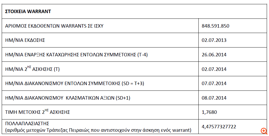 Η 2α Ιουλίου ορίζεται ως ημερομηνία δεύτερης άσκησης των warrants της Τράπεζας Πειραιώς, σύμφωνα με ανακοίνωση της τράπεζας.