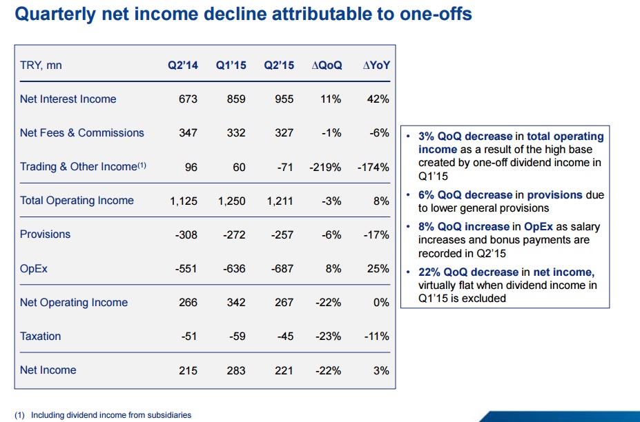 Τα καθαρά έσοδα από τόκους διαμορφώθηκα στο β’ τρίμηνο στα 955 εκατ. τουρκικές λίρες υψηλότερα κατά 11% σε σχέση με τα 859 εκατ. τουρκικές λίρες του α’ τριμήνου και ενισχυμένα κατά 42% συγκριτικά με τα 673 εκατ. τουρκικές λίρες του β’ τριμήνου του 2014.