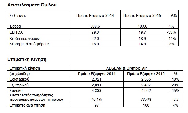 Η Aegean ανακοινώνει τα αποτελέσματα του πρώτου εξαμήνου 2015, παρουσιάζοντας ενοποιημένα έσοδα ύψους 403,6 εκατ. ευρώ, αυξημένα κατά 4% σε σχέση με το 2014. H επιβατική κίνηση αυξήθηκε κατά 15% και ανήλθε σε 5 εκατ. επιβάτες, με την εταιρεία να επενδύει σημαντικά σε στόλο και υψηλότερη χωρητικότητα, αυξάνοντας συχνότητες αλλά και προσθέτοντας νέους προορισμούς κυρίως στο δίκτυο εξωτερικού.