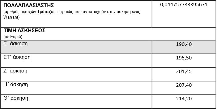 Συνεπεία της αύξησης της ονομαστικής αξίας της μετοχής και της ταυτόχρονης μείωσης, λόγω συνένωσης, του συνολικού αριθμού των υφιστάμενων μετοχών (reverse split) σε αναλογία μία (1) νέα μετοχή προς εκατό (100) παλαιές μετοχές και της μείωσης της ονομαστικής αξίας εκάστης μετοχής της Τράπεζας Πειραιώς, που αποφασίσθηκαν στην από 15.11.2015 Έκτακτη Γενική Συνέλευση των Μετόχων της Τράπεζας και εξειδικεύτηκαν από την από 17.11.2015 απόφαση του Διοικητικού Συμβουλίου, ο αριθμός των μετοχών που αντιστοιχεί σε κάθε Warrant και η τιμή ασκήσεως εκάστου Warrant αναπροσαρμόζονται αντιστοίχως ως κατωτέρω: