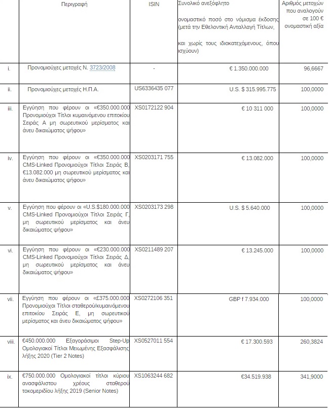Στο πλαίσιο αυτό και παράλληλα με την ενίσχυση από το ΤΧΣ η κατανομή βαρών στην ΑΜΚ της Εθνικής Τράπεζας θα αφορά και τις προνομιούχες μετοχές του δημοσίου (Ν.3723/2008 Αλογοσκούφη) ύψους 1,35 δισ. ευρώ, τις προνομιούχες μετοχές ΗΠΑ ύψους περίπου 316 εκατ. δολ. καθώς και όλα τα υπόλοιπα από τους τίτλους που δεν ανταλλάχθηκαν κατά την άσκηση διαχείρισης παθητικού της Τράπεζας.