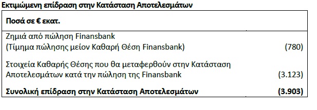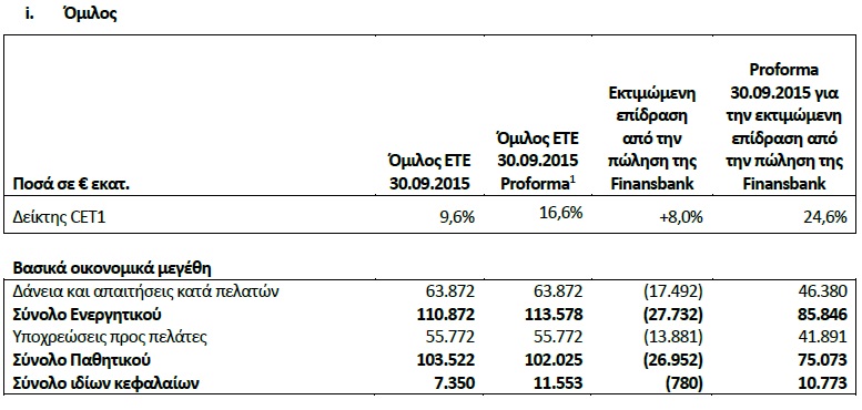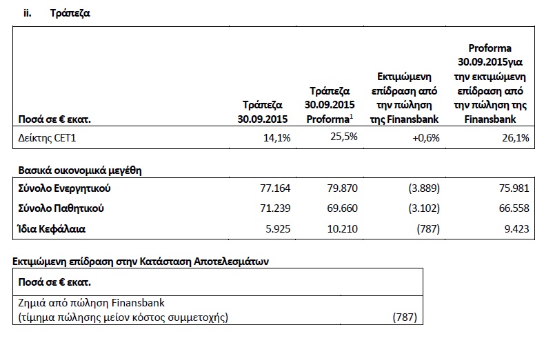 Η εκτιμώμενη επίδραση από την πώληση της Finansbank επί των βασικών οικονομικών μεγεθών της Τράπεζας και του Ομίλου με στοιχεία 30 Σεπτεμβρίου 2015 παρατίθεται κατωτέρω: