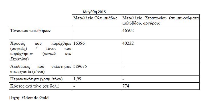 Στις 12 Ιανουαρίου η Eldorado Gold είχε ανακοινώσει ότι αναστέλλει, σε πρώτη φάση, τις εργασίες ανάπτυξης στις Σκουριές, ενώ, εάν μέχρι τον Μάρτιο δεν έχει λάβει τις απαιτούμενες αδειοδοτήσεις θα "παγώσει” τις εργασίες ανάπτυξης και στην Ολυμπιάδα. Παρόλ' αυτά, ο καναδικός όμιλος συνεχίζει να επενδύει στα τρία έργα της Βορειοανατολικής Χαλκιδικής, σύμφωνα με τις προβλέψεις (guidance) που παρείχε, χθες, για τη φετινή χρονιά.