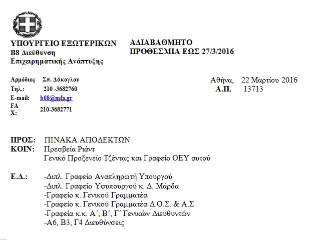 Το υπουργείο Εξωτερικών , αναγνωρίζοντας την σοβαρότητα του συγκεκριμένου αντικινήτρου στις ελληνικές εξαγωγές και γενικεύοντας την έρευνά (μετά τις καταγγελίες) ενημέρωσε (σύμφωνα με αποκλειστικές πληροφορίες του capital gr) εγγράφως τις επιχειρηματικές Οργανώσεις και τα Επιμελητήρια της χώρας για τις ενέργειες του . Παραθέτουμε ολόκληρο το σχετικό έγγραφο .