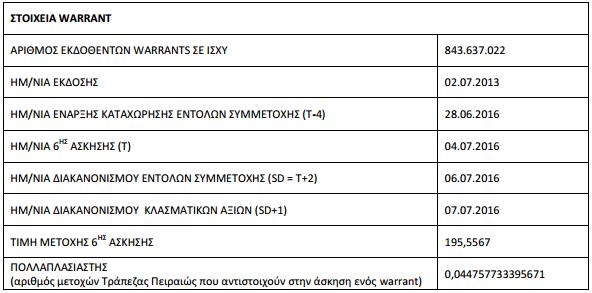Την 4η Ιουλίου 2016 είναι η ημερομηνία έκτης άσκησης των warrants, όπως ανακοινώθηκε από την Τράπεζα Πειραιώς